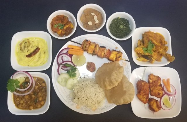 - Sides: Koshimbir (salad), Thecha (spicy chili paste), and Papad.